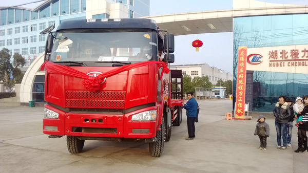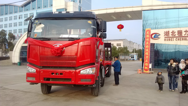 該車于年前客戶定購,于今天昨日交付給客戶,因為在客戶在我公司辦理分期付款業(yè)務(wù),在我市上戶,年檢也在我市,客戶對我們說:“其實上我市的牌照還省心些,上客戶當?shù)氐呐普漳陮忂€要季審,年審,費用也需要3000多,還不如一次性交由我公司來年審,省時省心!”。今天客戶在我市辦理上牌手續(xù)及辦理營運證。于晚上客戶提車走。客戶對這輛解放J6前四后八平板運輸車非常滿意。