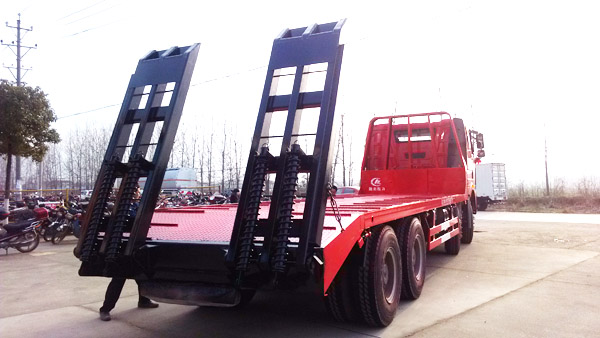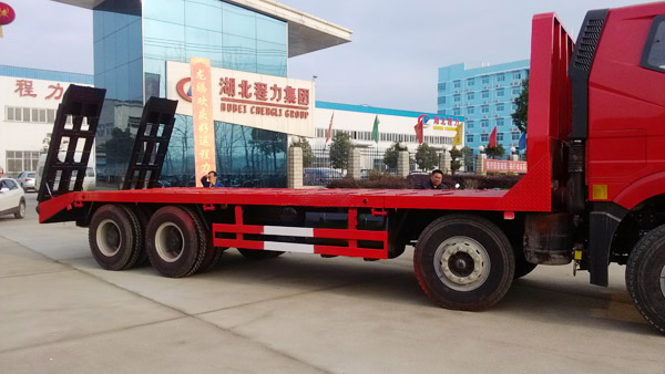 解放J6前四后八平板運輸車采用解放錫柴330EGR馬力發(fā)動機改裝,帶制動。