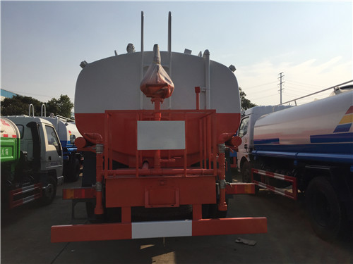 灑水車噴水出口: 前沖,后灑,后工作臺高炮,前沖(噴)后灑、帶側噴(花灑)、帶后工作平臺、平臺上安裝綠化灑水高炮(炮有大雨、中雨、毛毛雨、霧狀可調節),帶吸水管,帶消防接頭