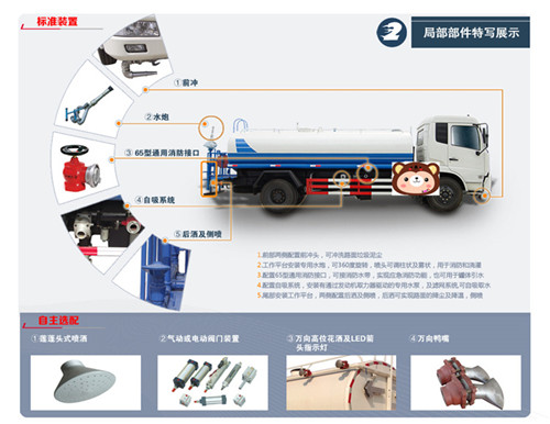 上裝配置:罐體有效容積為5立方灑水車,帶大功率專用灑水泵,罐體鋼板為4MM碳鋼Q235材質(zhì),罐體及整車外形尺寸按照公告。整車前沖、后灑、側(cè)噴、帶65消防接口,后平臺帶泡不帶門,前封頭帶水位計,后平臺主管路帶1寸澆花接口,后爬梯。平臺后部帶小安全告知牌:“隨時停車,注意安全”,帶兩根水管及陰陽端。罐體顏色:上銀灰下銀藍,罐體兩側(cè)噴“綠化灑水車”字樣,貼反光標(biāo)示。