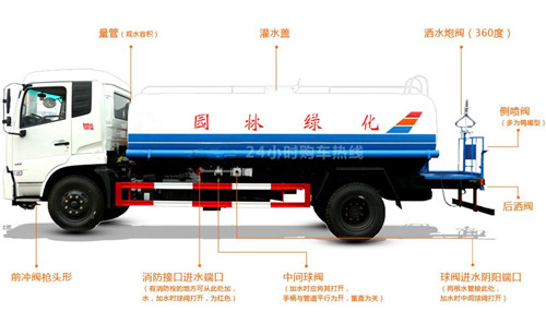 功能說明: 灑水車前裝有鴨形噴嘴或圓頭沖嘴,后面裝有圓柱開灑水噴嘴或蓮蓬頭噴嘴,后部有一工作平臺,裝配有水炮。帶消防接頭,帶自流閥,帶自吸功能,選配20米綠化消防卷盤。