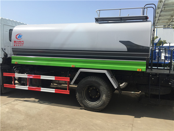 2、新款東風(fēng)專底灑水車標(biāo)配前沖、后灑、側(cè)噴、后工作平臺(tái)、綠化炮、自流閥、消防接口、水位計(jì)各1個(gè),輸水管3米2根,罐體右后上方帶花灑2個(gè)。