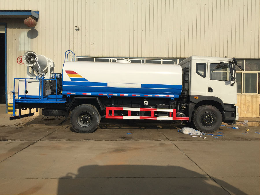單橋可裝50-60米噴霧機車型,閃亮登場。整車型號:DLQ5180GSSL5,底盤型號EQ5180GLVJ,東風新款T5駕駛室,4500MM軸距,國五,康機190馬力,陜齒小八檔變速箱,帶原裝ABS。前沖后灑,后工作平臺帶高炮,右位花灑,側噴。前橋5噸,后橋10噸,10.00鋼絲胎。后平臺上加裝50米霧機,水平射程50--55米,發電機組30KW,風機電機11KW,水泵電機3KW。