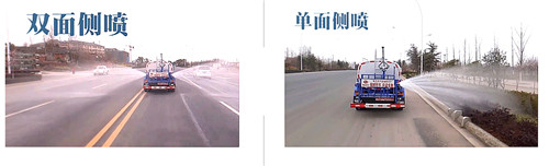 灑水車前噴頭位置較低,靠近地面,噴灑壓力較大,可用于沖洗路面;灑水車后噴頭一般左右安裝一個,其位置較高,故灑水面較寬,用于公路施工灑水。使用后噴時,應將前噴管關閉,使用可調噴頭灑水時,灑水寬度可以根據需要調整。灑水寬度越寬,中間重疊量越少,灑水密度越均勻。