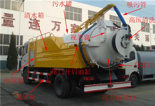 高壓清洗吸污車罐體是污罐的主體,其頂部開設有空氣孔,吸排孔。空氣孔與水氣分離器相通是空氣出入罐體的通道。入孔平時密封著維修時可以打開,吸排孔上連吸污膠管下連虹吸道污液出入罐體的通道。