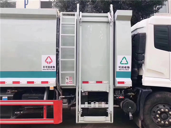 應對垃圾分類處理號召,程力公司先行推出分類式餐廚壓縮垃圾車。新公告車型,東風天錦分撿垃圾運輸車,整車分兩部分,箱體前帶4立方掛桶垃圾箱,側邊帶自卸三角垃圾斗,為可回收垃圾區(qū)。后帶8立方壓縮垃圾箱,尾部帶掛桶翻轉機構,為不可回收垃圾區(qū)。分區(qū)分類,利國利民。