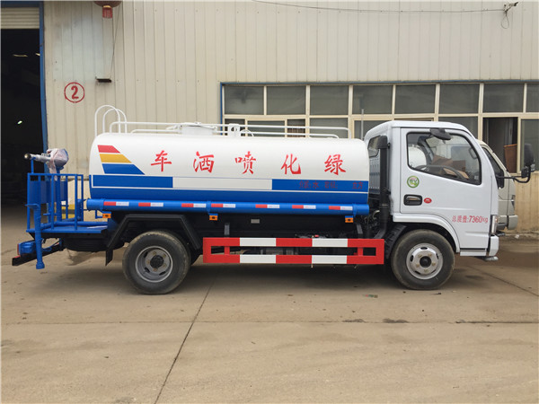 東風多利卡5方灑水車,朝柴73KW柴油發動機(95馬力),7.00-16尼龍胎,灑水車駕駛室顏色白色,自吸自排灑水泵,前沖,后灑,側噴,高位花灑,后平臺灑水炮,水罐容積5立方,2根罐體等長抽水管,一個消防接口,一自流口。