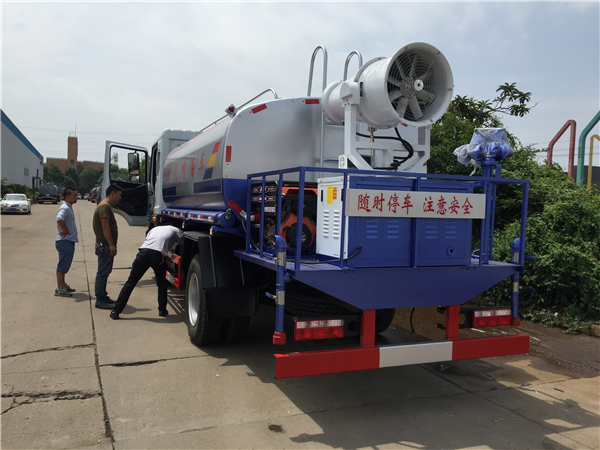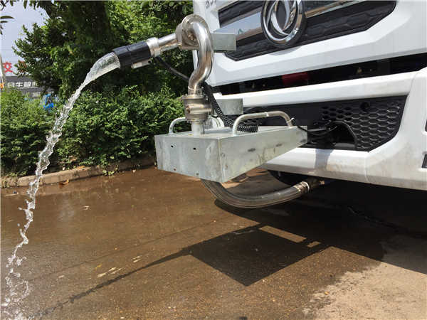福田灑水車(chē)前裝有鴨嘴形噴嘴或圓頭沖嘴,后面裝有圓柱形灑水噴嘴或蓮蓬頭噴嘴,后部有一工作平臺(tái),裝配有水炮。后部還可裝8個(gè)噴嘴。