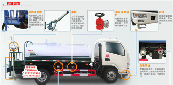 罐體用4MM碳鋼板制作,罐內隔板具有防波作用,以減低時風藍牌灑水車行駛時罐體液體的沖擊。整車帶一個專用灑水泵(垂直最大吸程6米),灑水寬度14米,射程28米。多功能灑水車配備2個前沖(噴)(能將路面泥巴、塵土、垃圾沖干凈);2個后灑(能均勻地將水灑在路面,一次灑水寬度14米)、2個側噴(花灑)(能均勻地將路旁綠化帶澆灌)、帶1個后工作平臺,平臺上安裝1個綠化灑水高炮(灑水炮可全方位旋轉,可連續調成直沖狀、大雨、小雨、毛毛雨,霧狀可調節沖洗高大樹木),引水時間<5min,流量90m3/h。帶1個消防接頭,帶1個自流閥,1個過濾裝置、人性化爬梯及側防護欄,安裝灑水音樂喇叭。