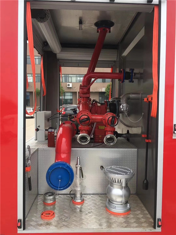 是我廠采用東風原裝二類底盤DFA11070DJ35D6基礎上改裝而成,東風輕發D28D10-40DA東風國六發動機,動力強勁,輸出功率75KW,102馬力,整車結構緊湊;專用部分由液罐、泵室、器材箱、動力輸出及傳動系統、管路系統、電氣系統等組成;罐體容積2-3噸(方);正規消防隊使用,PS10/20消防泵,最大射程45米;罐體采用4CM厚優質碳鋼Q235材質,防銹處理;廂體兩側帶卷簾門器材箱,可存放標配23套消防器材。