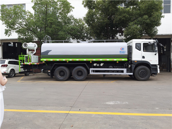 目前最受房地產歡迎的多功能灑水車為噴霧灑水車,該車除了常規的灑水車的配置以外,還加裝了一套噴霧系統,噴霧系統主要由電機,電泵和噴灑總成組成,最大作業半徑為35米,可以遙控電控,噴霧系統可以旋轉,點頭工作。噴霧系統最大電機功率高達5.5千瓦,水泵點功率6千瓦,風機攜帶18個噴霧頭,噴霧頭可更換。