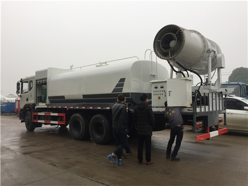 7、重汽100米多功能抑塵車后灑:后部左右各安裝一個圓柱噴頭;各個進出水孔及操作部位要有指示說明,保證噴嘴噴出的水為均勻的扇面形。自動控制采用駕駛室內撬板開關控制,并粘貼標識,操作按鈕固定牢固。