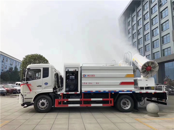 東風12噸抑塵車選配50米噴霧機達到除塵效果。霧炮機是根據風送原理,先使用進口高壓泵、微細霧化噴嘴將水霧化,再利用風機風量和風壓將霧化后的水霧送到較遠距離,使得水霧到達較遠距離同時能夠覆蓋更大面積,水霧與粉塵凝結后降落,從而達到降塵目的。