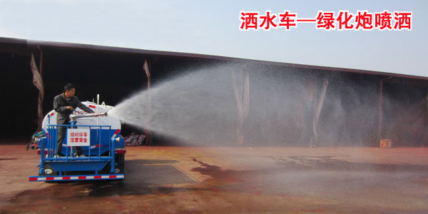 多功能灑水車帶前沖、后灑、帶側噴、帶后工作平臺。灑水車后工作平臺上安裝綠化灑水高炮。高炮可360°旋轉,可連續調成直沖狀、大雨、小雨、毛毛雨、霧狀等多種形態,并配備專用大功率灑水泵,帶消防接頭,帶自流閥,帶自吸功能。灑水車垂直吸程≥6米,灑水寬度≥14米,高炮射程≥28米。